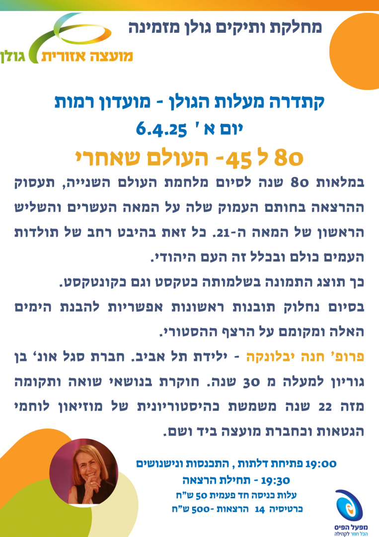 אבל רגע לפני- בקתדרה ברמות בראשון בערב- הרצאה מרתקת של פרופ' חנה יבלונקה, מומחית עולמית בתחום חקר השואה "80 ל 45 - העולם שאחרי" מומלץ !